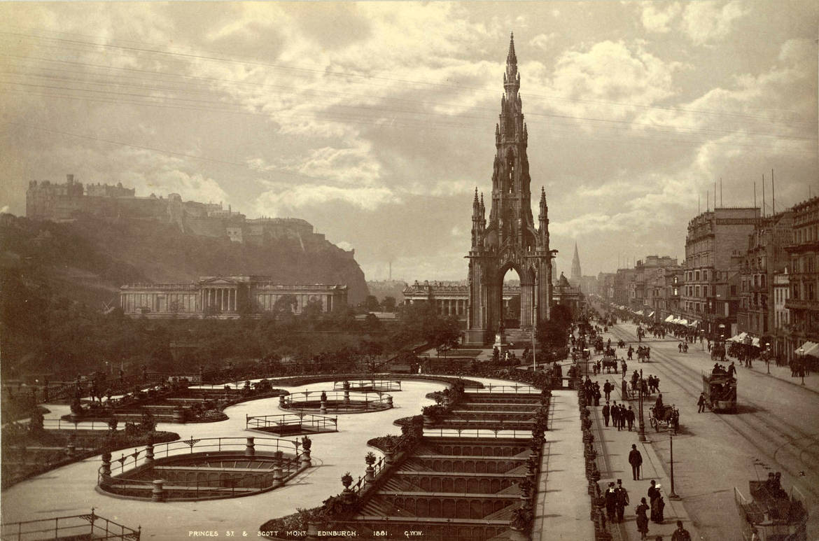 Princes Street – in another photo by George Washington Wilson, we can see Princes Street, the imposing Sir Walter Scott Monument, the Gallery of Art and distant Edinburgh Castle. Taken in 1881, this shot provides a good glimpse of the everyday lives of Edinbugh residents in Sarah Snow’s time. Fashionable hats and long dresses for the ladies, suits, hats and canes for the gentlemen. People walking or using horse drawn carriages, trams, and bicycles to get about. Busy store fronts with people shopping for goods on Princes Street, just like they do today.