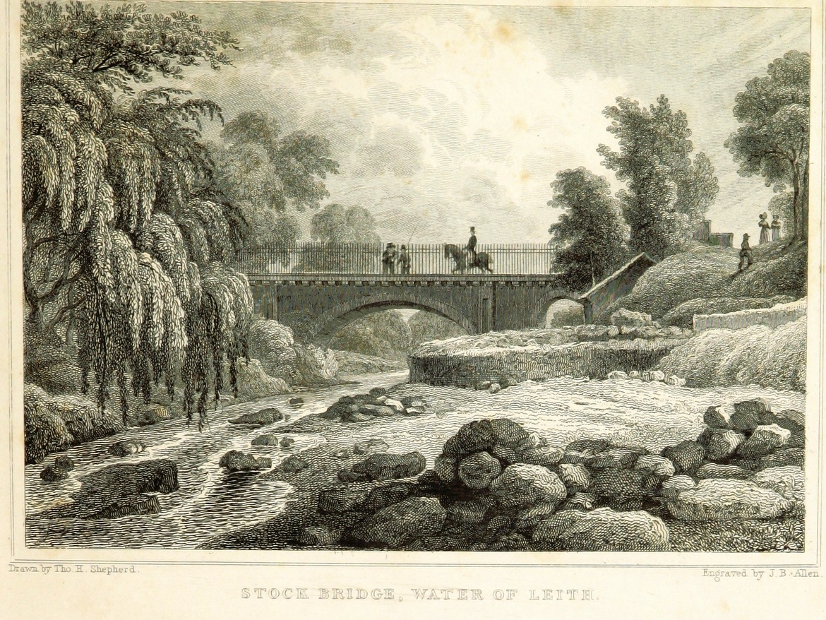 Stockbridge: Sarah Snow lives in the genteel New Town of Edinburgh, which has Stockbridge at its heart. This drawing by Shepherd shows a very gentle view of the Water of Leith in Stockbridge – a body of water that runs through many parts of the city. The fashions of the men and women in the drawing show that it’s a little before Sarah’s time, but she too would have been able to enjoy a stroll by the river.